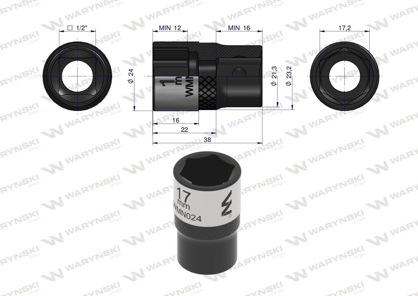 Nasadka sześciokątna 1/2". 17 mm. CrV50BV30.