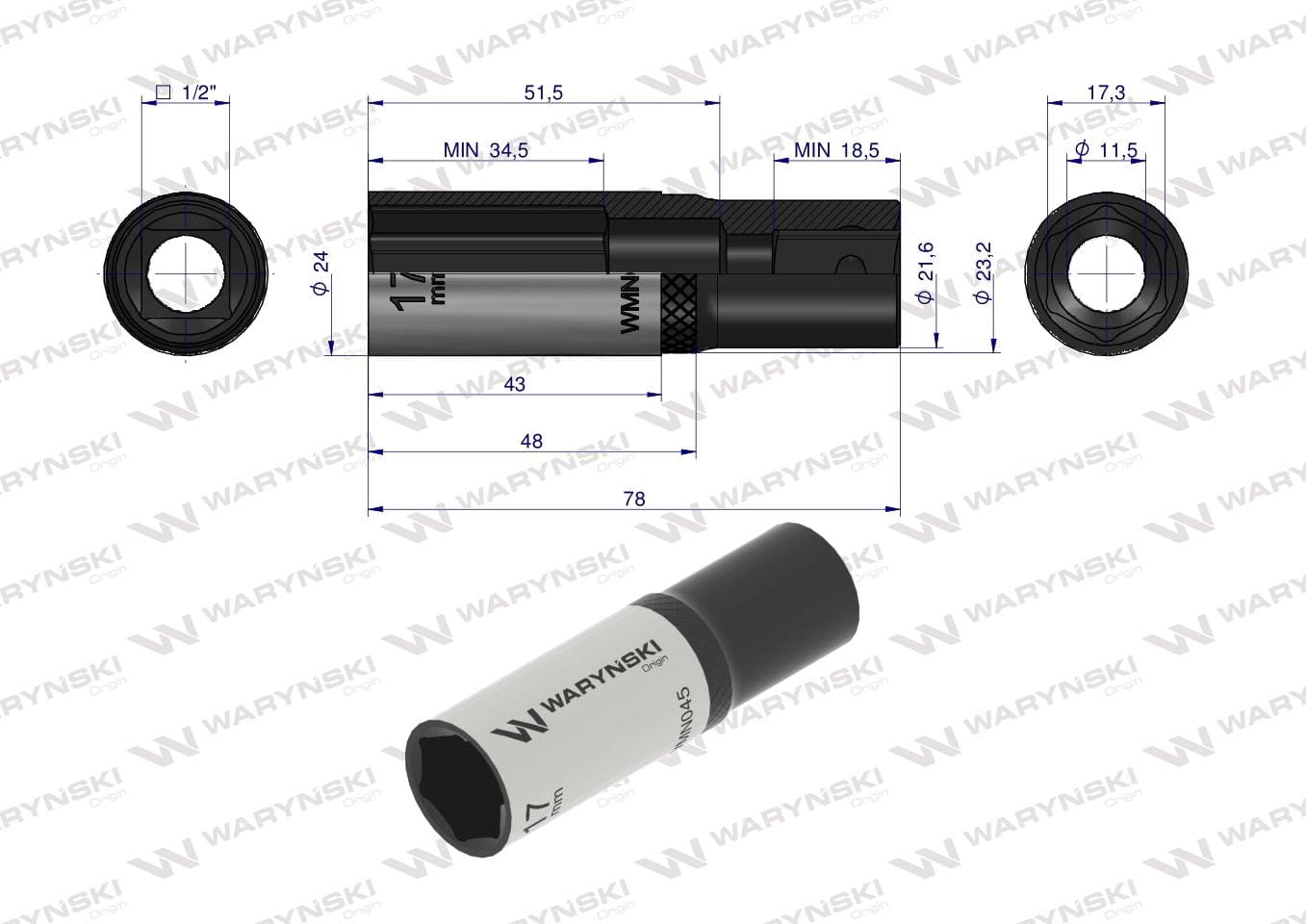 Nasadka sześciokątna 1/2". 17 mm. długa. CrV50BV30