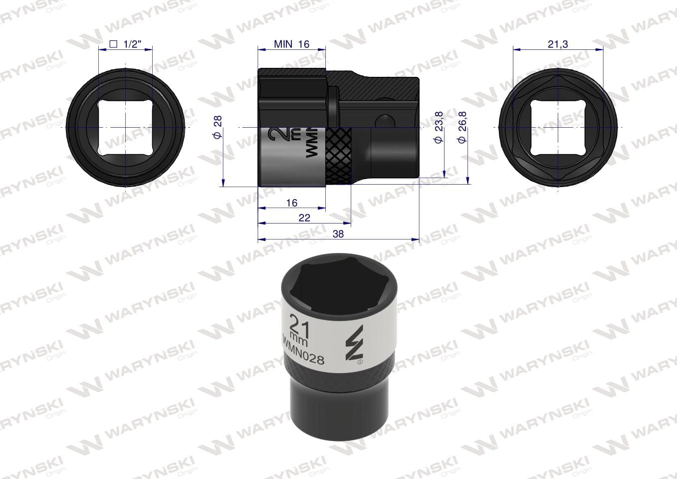 Nasadka sześciokątna 1/2". 21 mm. CrV50BV30.