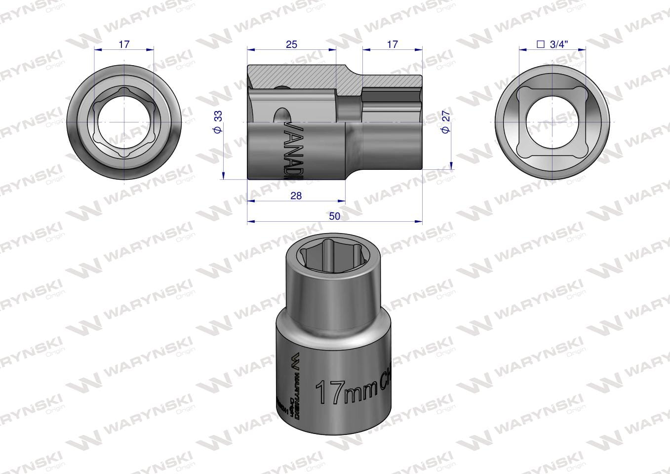Nasadka sześciokątna 3/4". 17 mm. CrV50BV30.